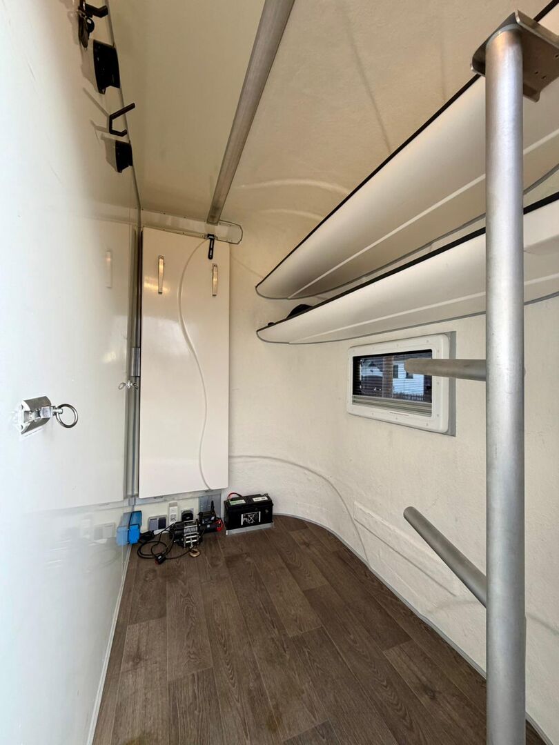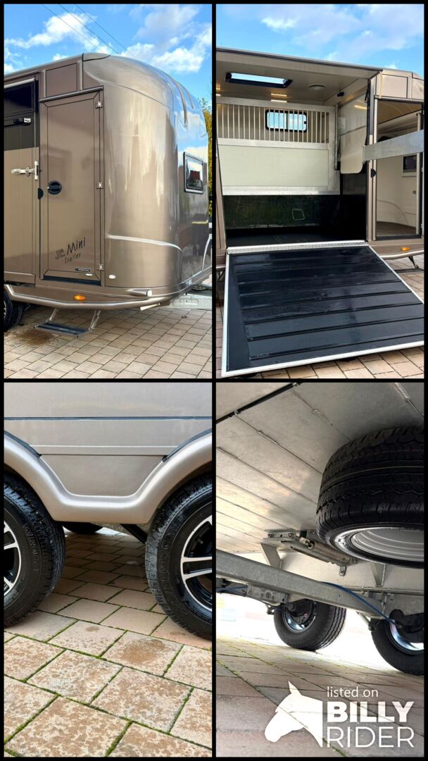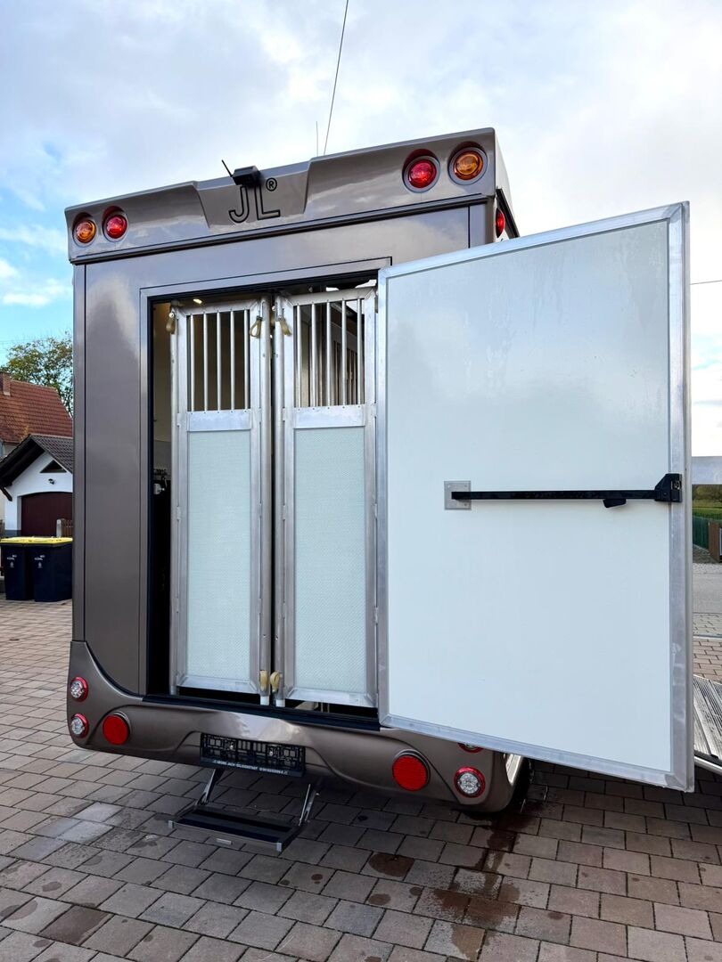 - First registration 01/2024 - Unladen weight 1215 kg - Permissible total weight 2700 kg - Max. drawbar load 150 kg - Side ramp - Stallion separation / stallion version - Roof hatch - Electric ventilation system in the horse compartment - 3 windows in the horse compartment - 2 folding steps - ALU FLOOR - Rubber floor - Sliding or completely removable partition wall - Tandem axle - Chassis with shock absorbers for 100 km/h approval - Step protection - LED lighting - Tail guard - Interior camera and reversing camera - Cable winch with battery for saddle locker - Drawbar guard - Alloy rims - Spare wheel