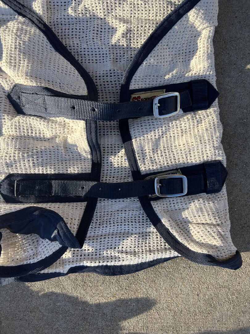 New with tags 84 inch Irish knit anti sweat sheet. Quick-drying and can be used as an underlayer, trailering sheet, or in the stall. The two-buckle open front with hook and loop assist closure, smooth nylon lining at the shoulders to prevent rubbing and front surcingle are adjustable for a perfect fit. Fleece withers