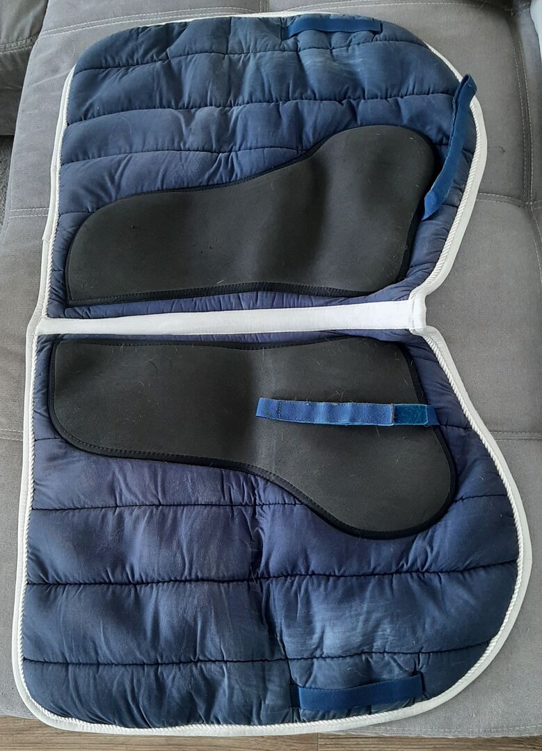 Anti-slip saddle pad (both sides) - For sale is an anti-slip saddle pad in dark blue, size WB. It was used with pleasure and therefore has the usual signs of use on the belt support, as well as slight wear from the inside. However, it is fully functional, has no holes or the like and was washed by me once gently by hand. I had the saddle pad on a horse with a very smooth coat lie and the saddle pad has proven quite good services :)