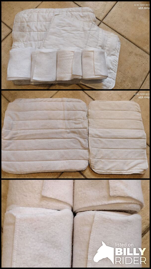Bandages and bandaging underlays set 4x white WBlood - Simple bandaging set consisting of 4 fleece bandages with Velcro fastener, width 12 cm 2 bandage pads for the front (37 x 28 cm) and 2 for the back (43 x 37.5 cm) made of cotton, fine terry cloth inside. Very good used condition with slight signs of wear. Non-smoking household. Private sale therefore no guarantee, warranty or return.