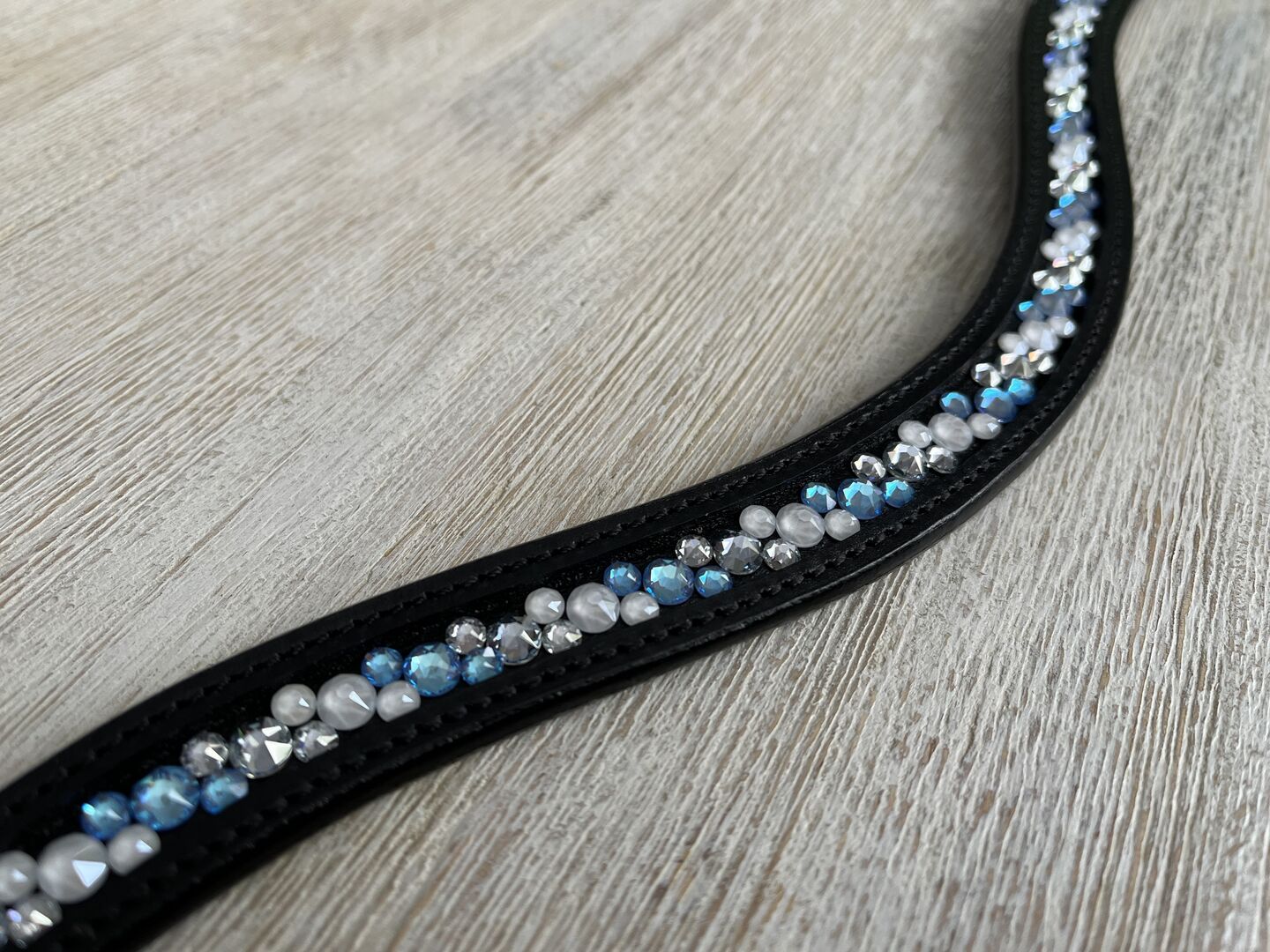 Swarovski Crystal: light blue, silver with blue shimmer, white Leather: black Size: WB (length 42 cm), WB-XL/COB/PONY also available on request