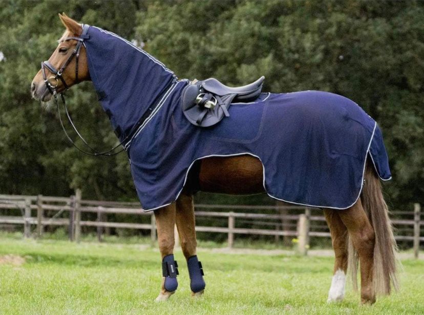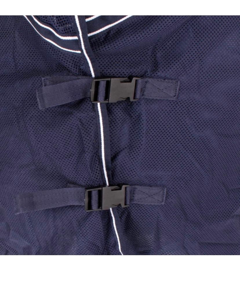 BUSSE Riding rug Moskito II, Navy 145cm blue - BUSSE Riding rug Moskito II, Navy 145cm blue Fly riding rug for undisturbed riding fun Fit/features:Neck section with Velcro fasteners, can also be rolled down and securely fastened with strapsNeck section can be fastened to bridle with Velcro loopsCut-out for English saddlesRiding cut on the side for undisturbed aidsTwo adjustable PVC snap fasteners in the chest areaWith tail cover and backhand strapsMaterial/Material function:Close-meshed and hard-wearing polyester mesh