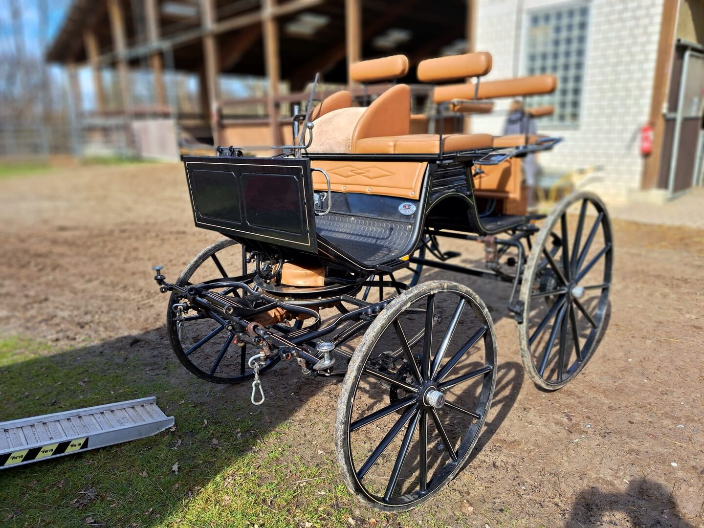 Carriage + harness for sale by order - One and two-horse carriage model Spider for large horses by Glinkowski. Track width 148, wheels 90/120, seat block 135, groom seat for 2 persons, 4 hydraulic disk brakes, hydraulic turntable brake, adjustable turntable control, steering delay, steel drawbar and wooden lugs. Genuine leather upholstery, adjustable center seat. Always protected and stored dry in the trailer as a garage. Sold together with Zilko Classic harness in mint condition (new value € 1,500), English leather leashes, 2 lamps in their own case and Böckmann trailer as garage. The trailer is roadworthy but not registered and only serves as a garage. The floor is good (aluminum) but the side walls are not in order. For sale by order.