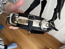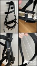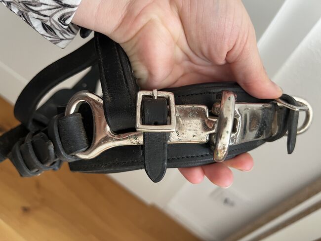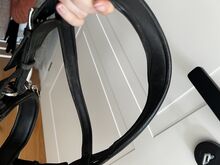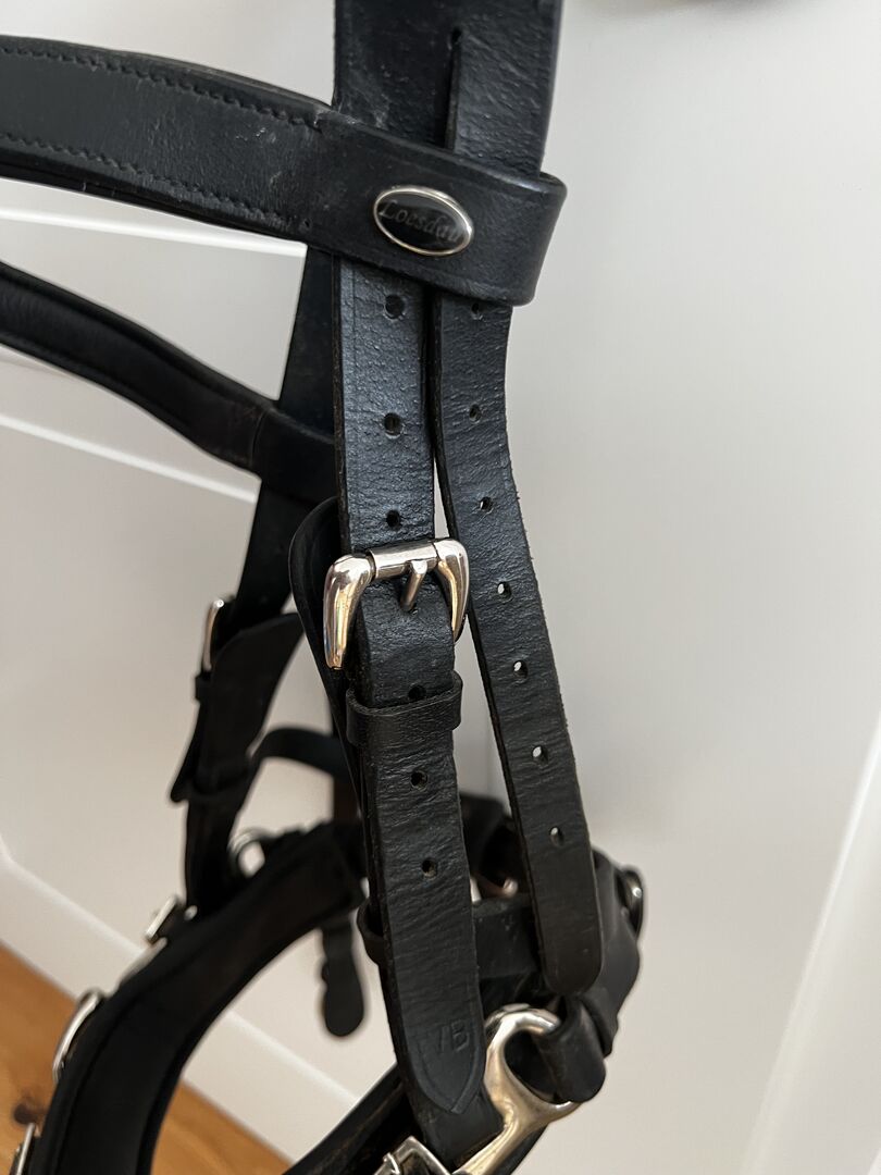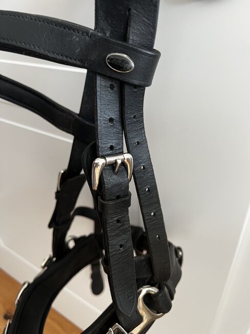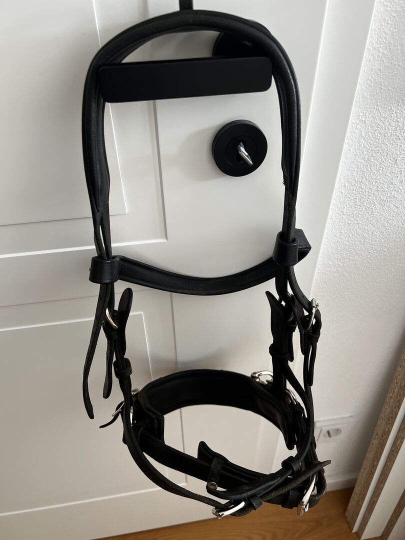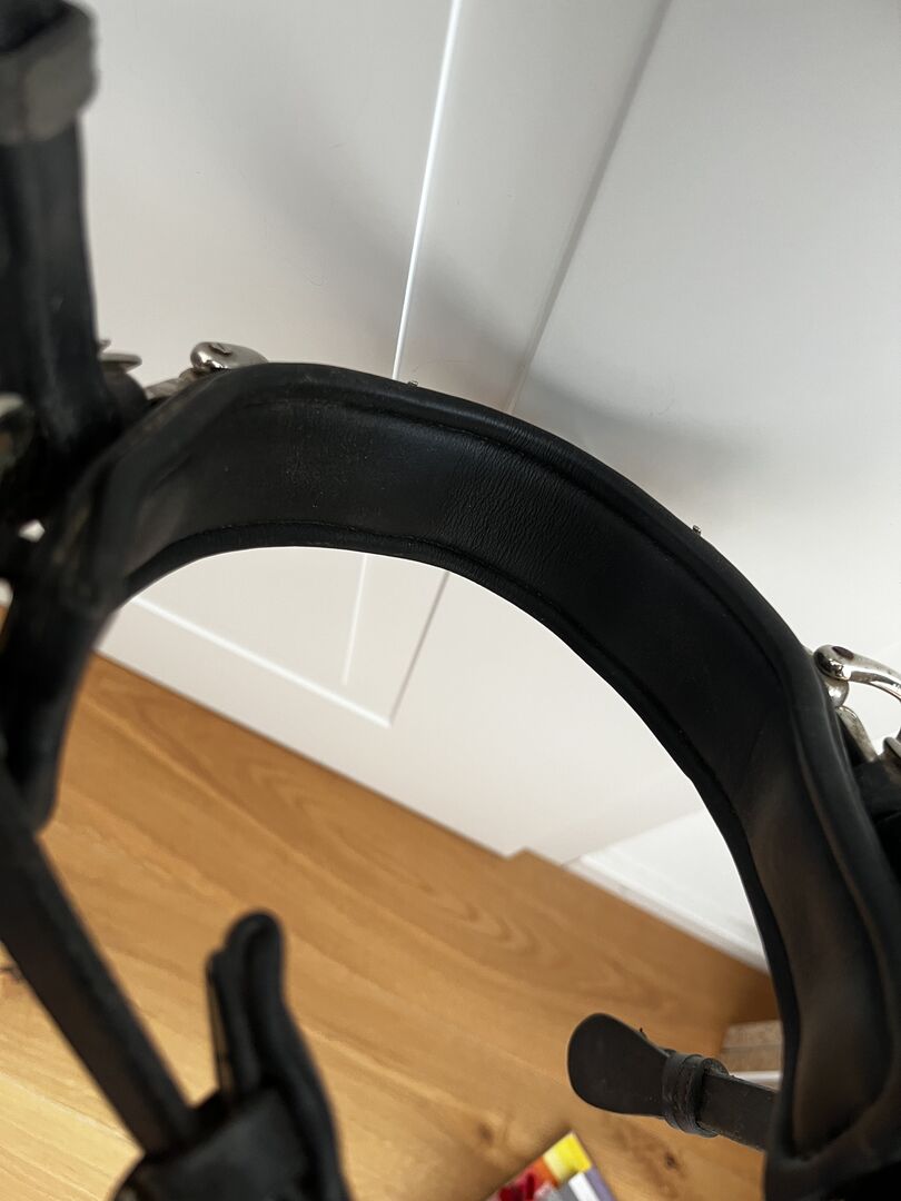 Cavesson leather size VB Cob - Selling a rarely used, very high quality cavesson from Loesdau, it should be the Comfort model (NP 100€). Size Thoroughbred, but fits the strong Spanish head well. Three rings on the four-part noseband, therefore very flexible for individual work. It has been hanging unused for three years now, so there is some verdigris on the metal of the nose piece, and the coating has also flaked off in places. However, the leather is still absolutely soft and elastic and the metal is easy to move. The nose and poll pads are also still nice and soft. I am still looking for the strap to attach the bit, I have never used it and have stored it somewhere.