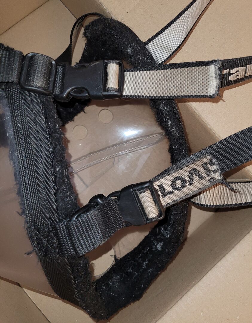 Equivizor / Eye protection mask for horses / Therapeutic mask - - Used mask in good condition - has two small cracks which do not restrict its function - for therapeutic purposes - e.g. for periodic eye inflammation, after operations etc - the straps have been shortened - the mask has been cleaned by hand - Size: FULL (also fits a COB size) - there is also a new, matching fly mask - high NP