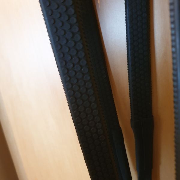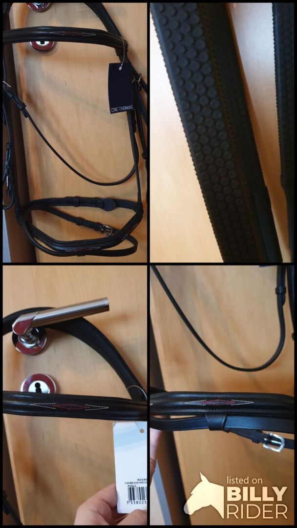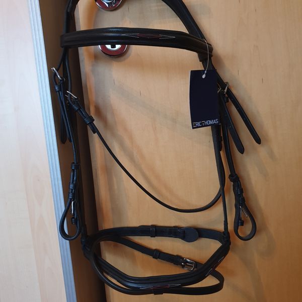 ERIC THOMAS HYBRID Snaffle Shape; WB , new with rubber reins - Sell the new, unused snaffle bridle form of Thomas Eric in black and the size warmblood / full. The snaffle has a wide, soft headpiece and a narrow but soft padded noseband.