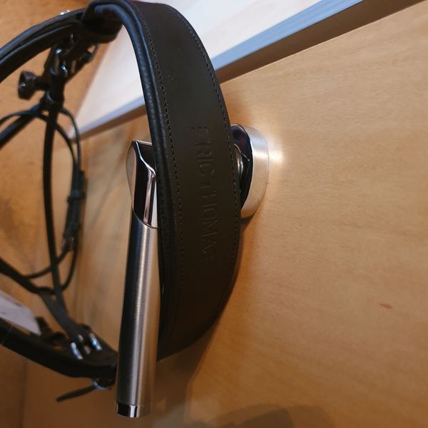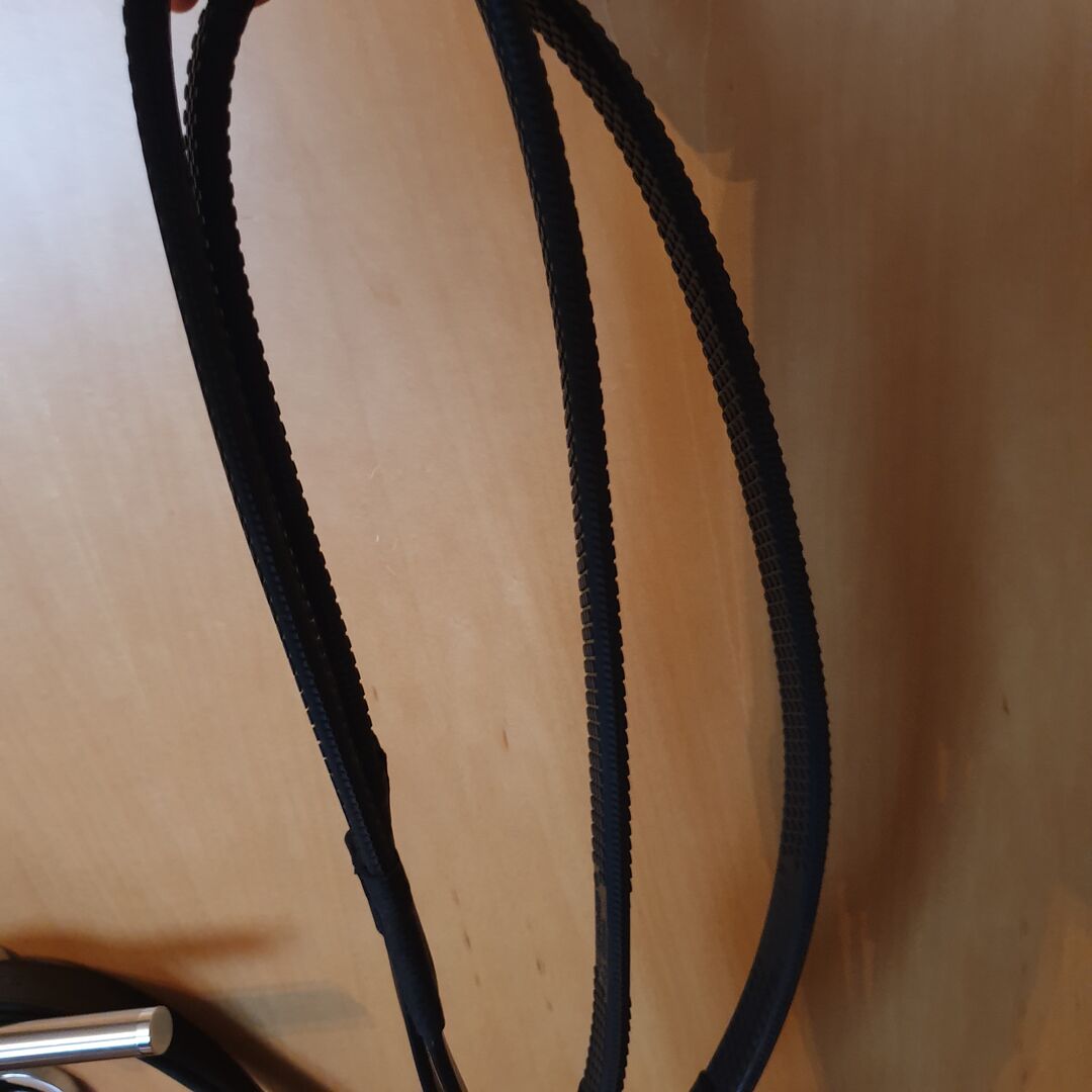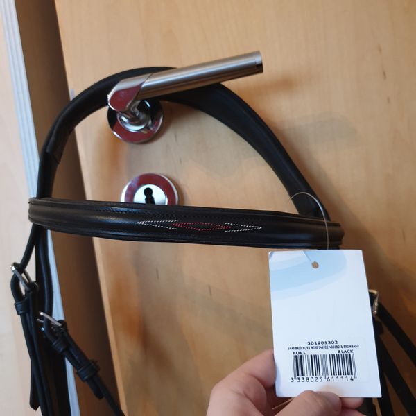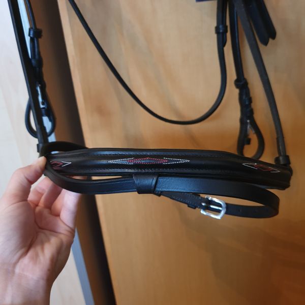 Manufacturer description: Snaffle made of aniline leather. Headgear, browband and noseband are lined with Clarino microfibre. Flexible stainless steel inserts in the noseband and headpiece adapt perfectly to the shape of the horse's head. Rubber reins with a 2 mm thick nylon insert in the reins. Stainless steel buckles. "