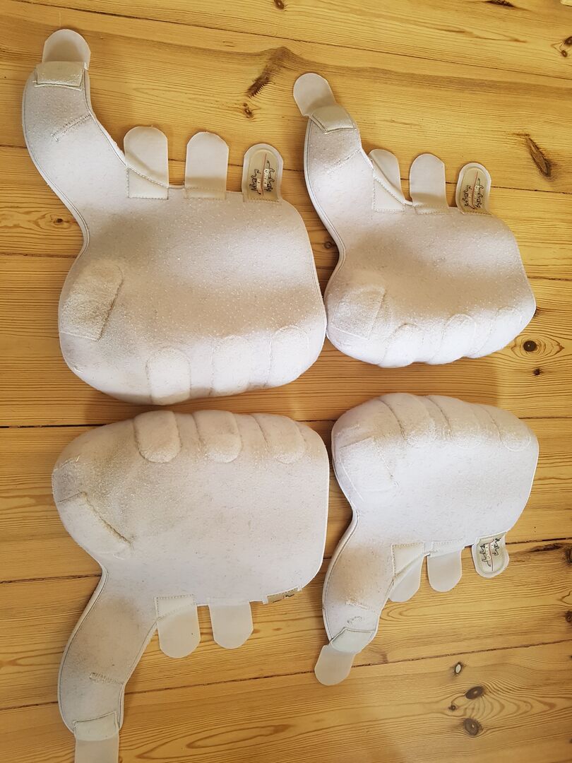 ESKADRON dressage boots Pro Dressage white - I offer here used Eskadron dressage boots Pro Dressage in white. It is a set with the respective gaiters for front and rear, so a total of 4 pieces. The dressage boots are equipped with a fluffy top and elastic edging band and enclose the fetlock head, support tendons and ligaments in daily dressage work or at the tournament. I find the self-fastening material very practical, which still holds bomb. The inner lining is made of easy-care neoprene. The slight discoloration you can see on the photos and are unfortunately unavoidable in the color. Original price at that time: 120 € Current price: 160 € Size: Full