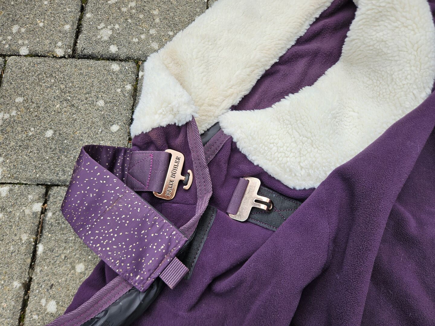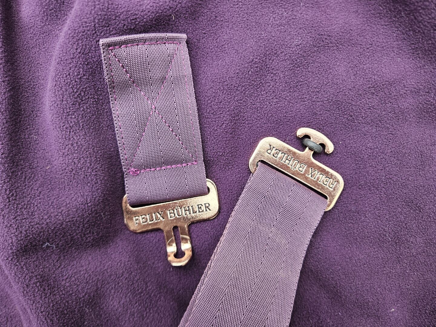 Felix Bühler sweat rug Sparkling 145cm - Cosy, warm and breathable sweat rug made of high-quality anti-pilling fleece with a soft, thickly padded teddy fleece collar. Enchanting print of multi-colored glitter particles on the left rear rug area. Smooth, fur-friendly inner lining in the chest and shoulder area to prevent chafing. With belly strap, concealed T-hook front fastening and tail strap. 100 % polyester. Only worn a few times on the horse. Perfect condition. NP 79,90€.