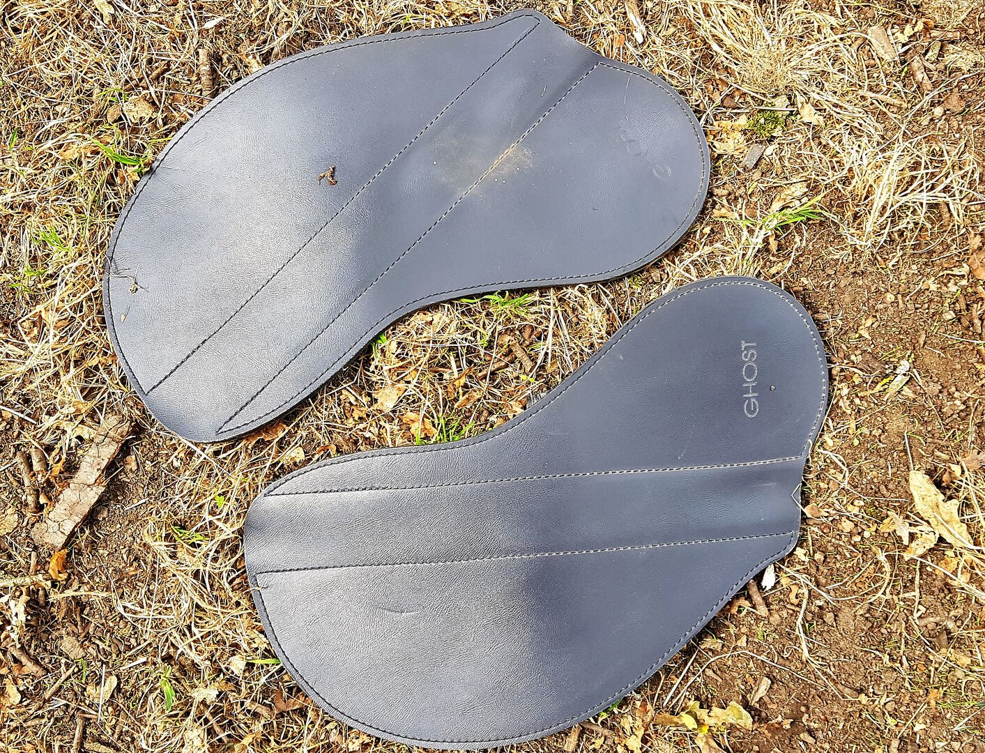 As new. Fenders slide on, made in micropell dark gray (vegan leather), The stirrup leathers slip inside, so very practicle if you want to ride without chaps and still stay with classic leathers. For me, I sell them because I prefer to ride without fenders