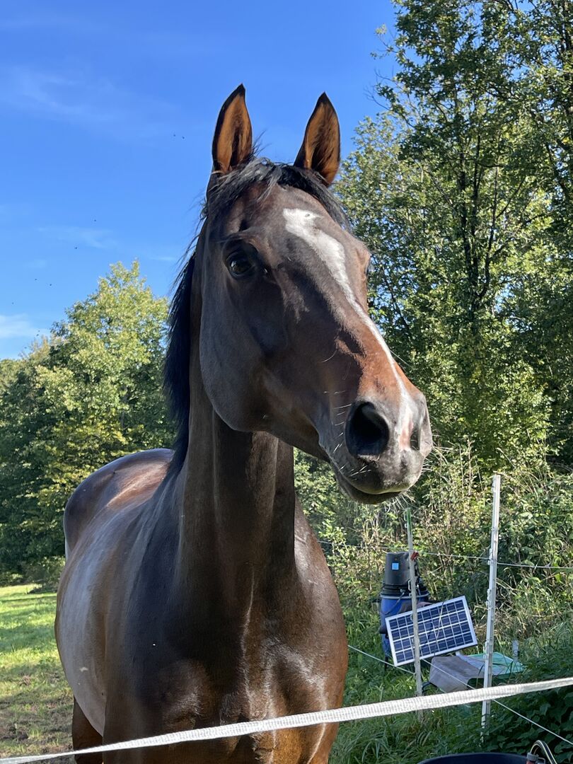Santos has been in my possession for about 5 years. He was then used by me in a variety of ways in jumping, dressage, cross-country and ground work. My focus was always on dressage, as I enjoyed it the most. He always tried to adopt a good attitude. He only had horseshoes at the front and only for the first few months, as I switched him to barehooves relatively quickly. The phase of being in good condition didn't last long. He generally likes to run on soft ground and tries to avoid stony paths. Otherwise, he is a very confident off-road horse and also enjoys nice rides and the variety. He has been stabled for most years, with a paddock box and access to winter and summer meadows. He has been in a small community in an open stable for a few months now. Santos is a socially intelligent horse, so far he has always proved himself at the front of a small herd. But always with respectful interaction with his pasture partners. He is also a very grateful horse, which makes working with him all the more enjoyable.
