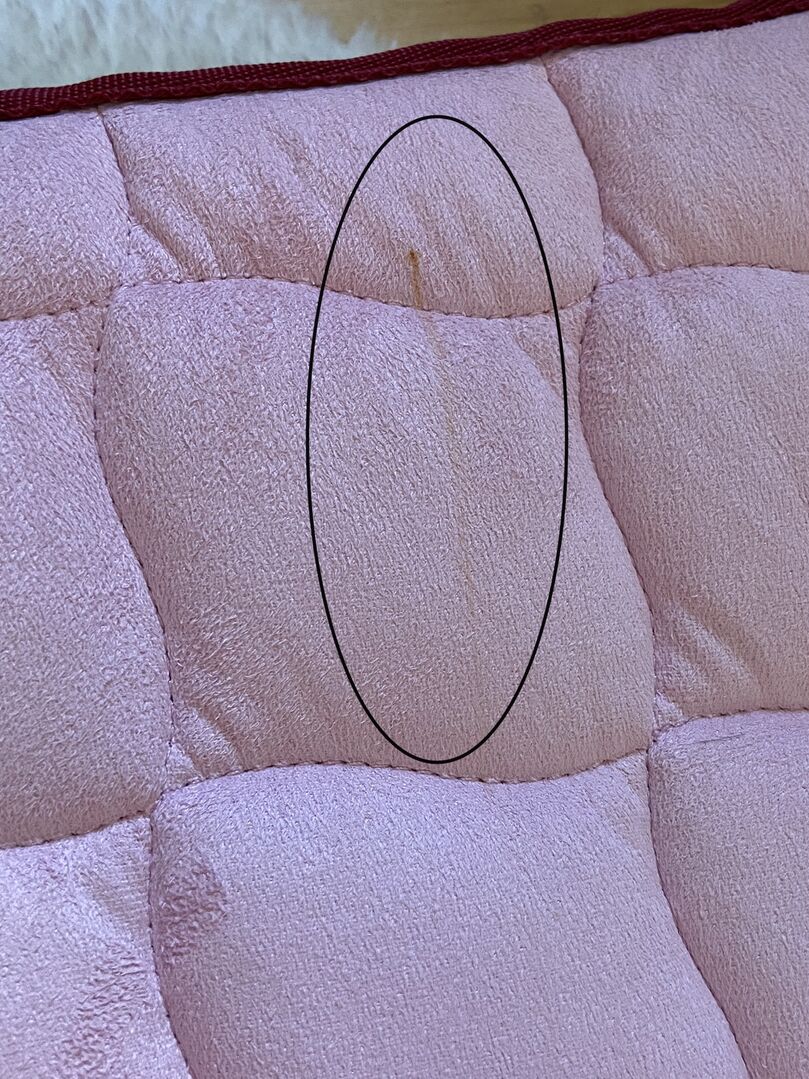 HKM saddle pad pink velvet - I sell a pink HKM saddle pad. It has a small hole and a slight soiling (see pictures) the saddle pad is in size Vs