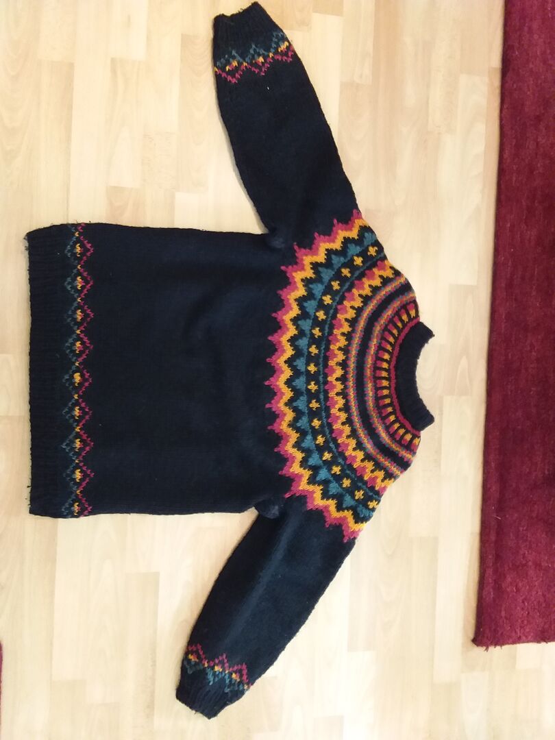 Iceland sweater - Icelandic sweater in black with colored pattern. Length neckline to hem: 74cm, width: 55cm, sleeve cuffs to armpit: 44cm