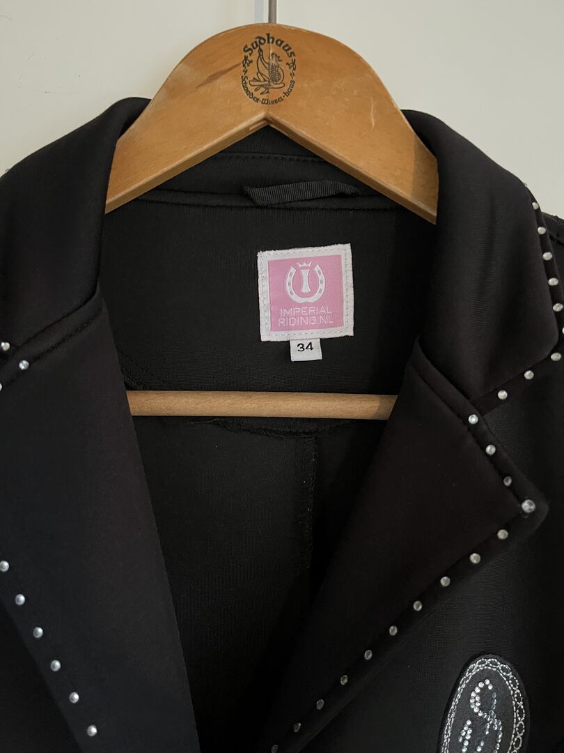 Imperial Riding show jacket for sale - I am selling my beloved black competition jacket from Imperial Riding. The jacket has been used a lot and is missing a few glitter stones. The thread on the sleeve is coming loose. Size 34 Np. 130€