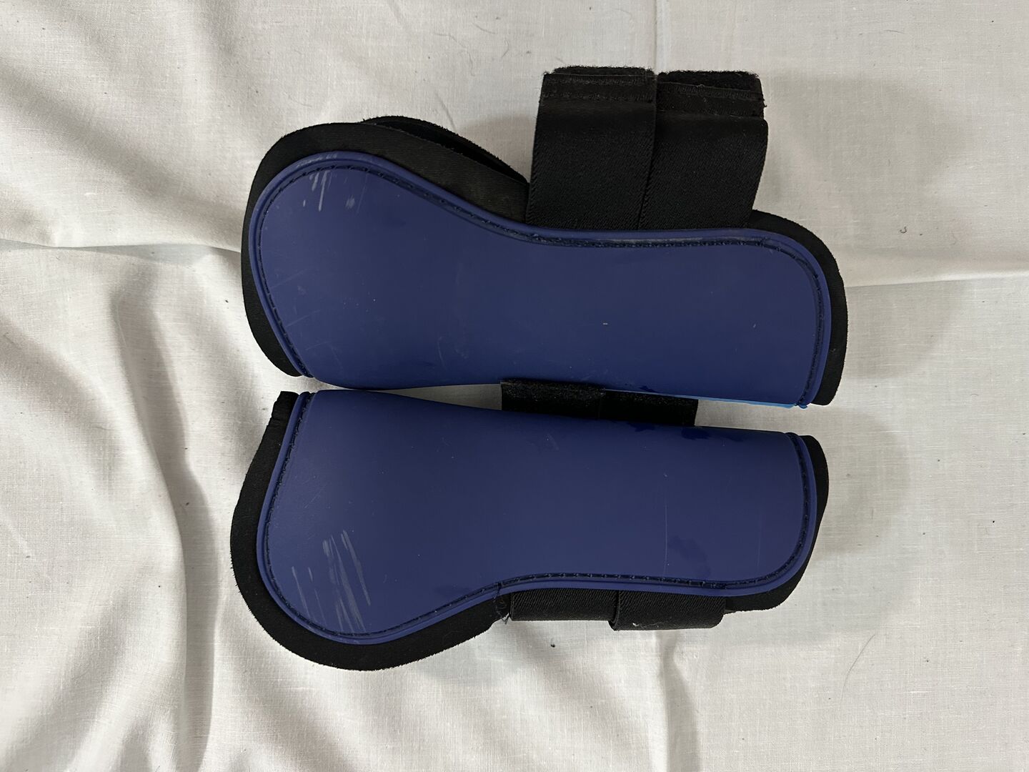 Jumping boots size pony dark blue Showmaster - Showmaster jumping boots in dark blue size pony. Velcro fastening perfect. Slight signs of wear on the inside and outside.