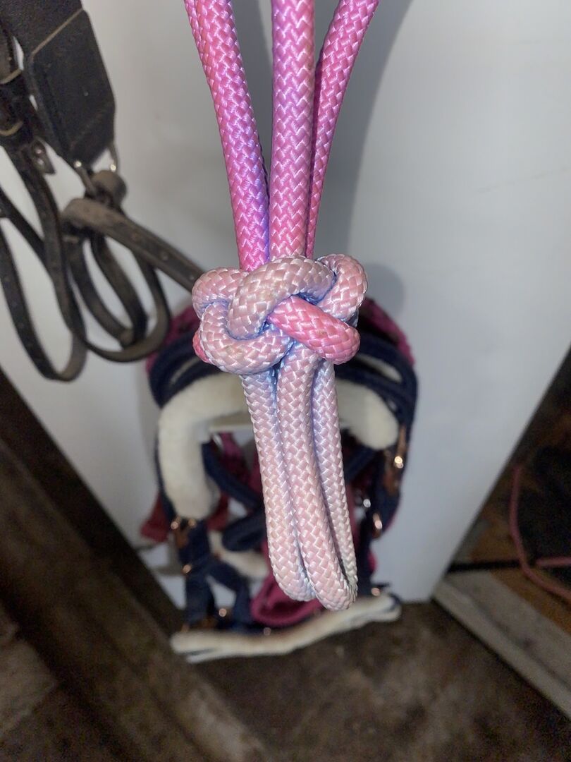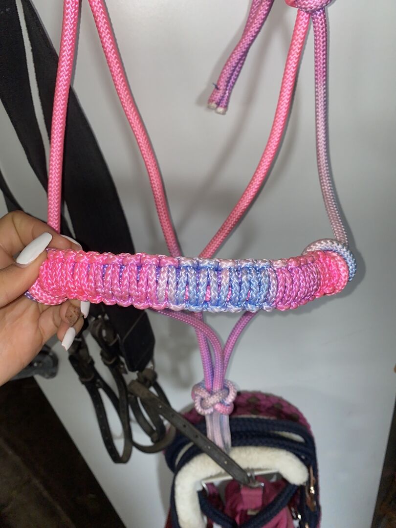 Knot Holder - Hello for sale here is a 1 time worn knotted halter and the color candy and the size pony. The halter is sold because I no longer have a horse that fits the halter