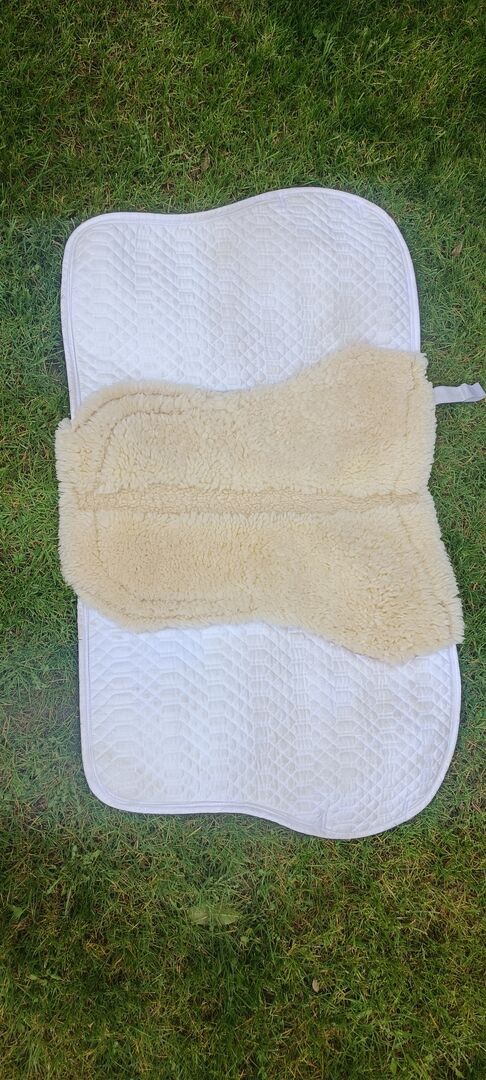 Lambskin saddle pad white, show saddle pad - Without defects, retail price 120€, anatomical shape Description from the dealer: Sporty, elegant saddle pad with a lambskin crown, lambskin withers pad and lambskin underlay in the entire saddle support area. The fur is shorn shorter along the back line to ensure optimum freedom of the spine. Edging with shiny, double decorative cord. Saddle and girth loops with practical KV. Fur: 100 % merino lambskin, quilted fabric: upper material 70 % polyester, 30 % cotton, padding and underside 100 % polyester. Washable at 30 degrees in the wool wash program. Please only use lambskin detergent