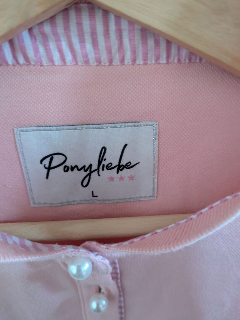 Pony love polo shirt pink - Very pretty polo shirt with pearl buttons by ponyliebe in pink, size L. Fits true to size. Silver embroidery details and ruffled stand-up collar. New with label. Original price 39€. Shoulder width 41cm Chest width 48cm