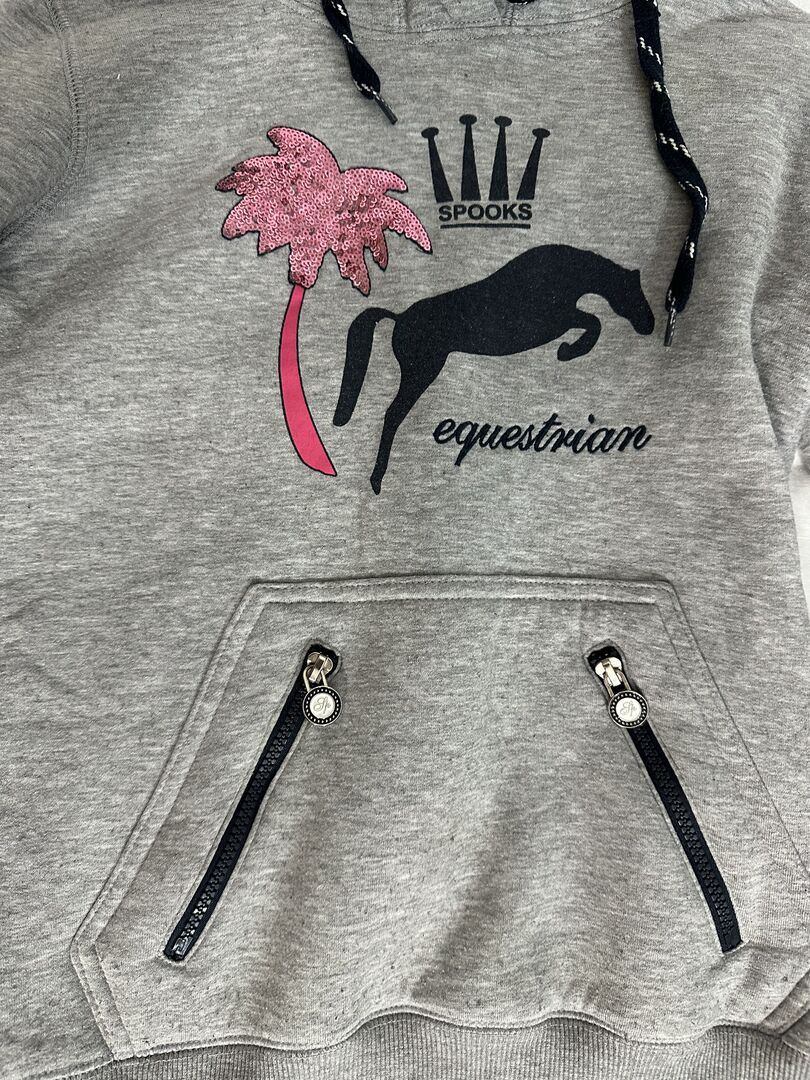 Sweater Spooks light gray XS - Light gray sweater from Spooks in light gray in size XS. Fanny pack with zippers that work perfectly. "Pink palm tree" with sequins. Warm sweater with teddy fur on the inside.
