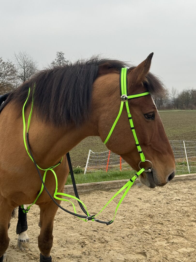 Synthetic bridle NEON GREEN shiny with martingale - First class synthetic bridle neon green shiny with martingale Shiny Weather resistant With martingale Including reins, partially rubberized First-class synthetic bridle for horses, shiny neon green with martingale, without noseband, including reins. This bridle is partially soft-lined, very easy to care for, weather-resistant and lightweight. The reins are partially rubberized. A product from the Super Steeds brand.