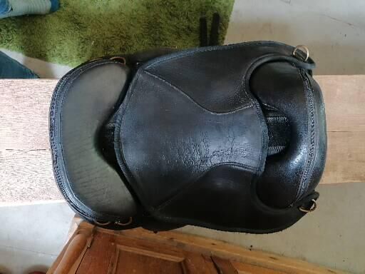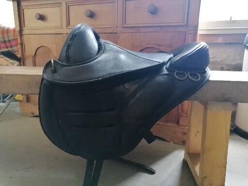 Older style Torsion Saddle, well loved, some signs of wear but nothing that affects function. Lovely comfortable saddle for horse and rider. Small repair to wooden pommel. Comes with Equitex treeless saddle pad. Both black. Any questions please ask.