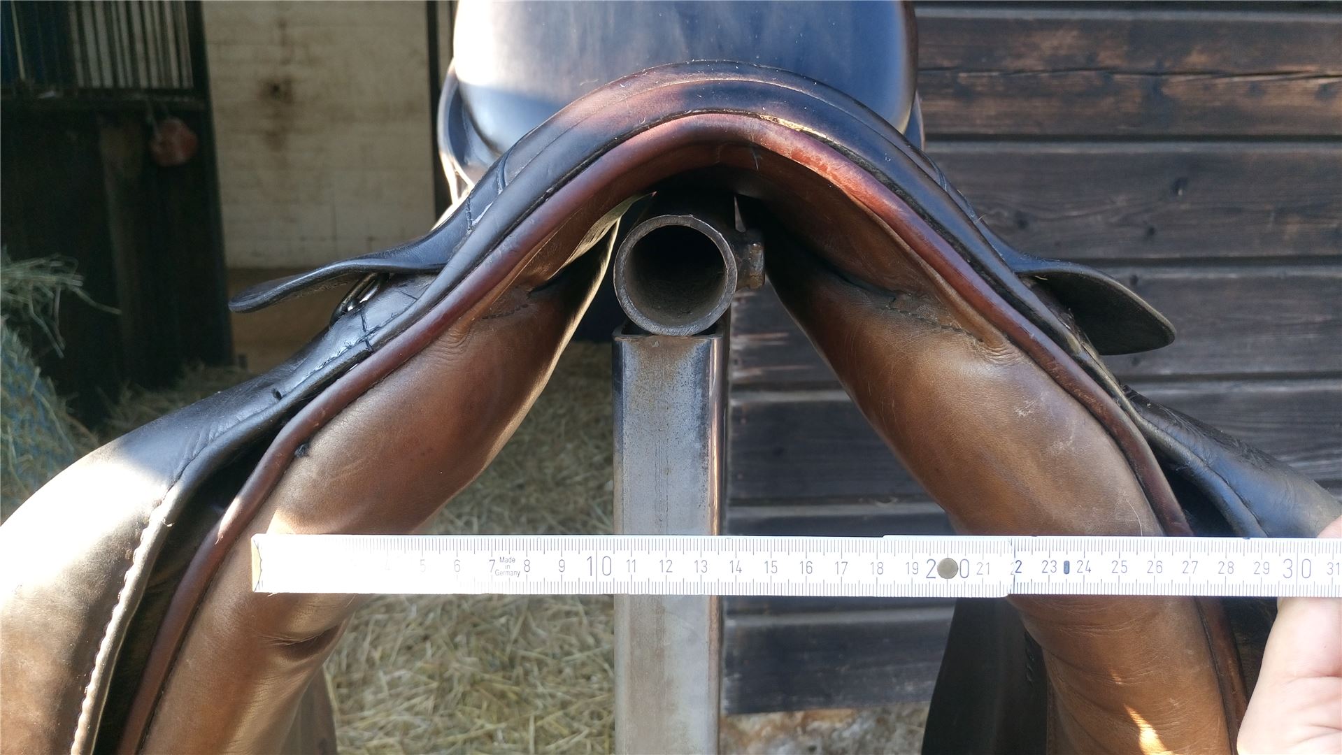 It is treeless and can be easily adjusted by the saddler. I have had it for several years, but it is still in a very good condition - as it was made directly by a saddler (handmade). Up to now he fit very well on different horses (Spaniard, Pony and cold blood). About 17 inches, brown leather. Unfortunately, I don't know the brand or it doesn't exist.