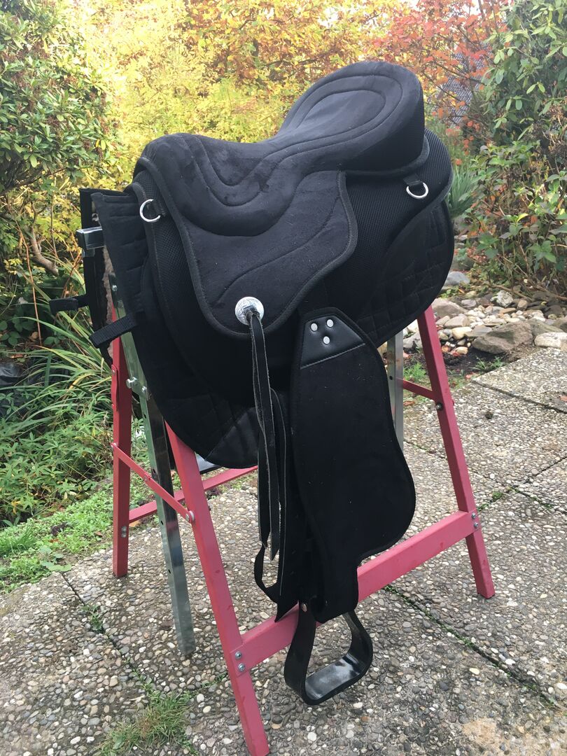 - Totally flexible, therefore the saddle fits different types of horses - Adjustable stirrup leathers - Removable seat - Wide contact surface, no pressure points - Matching girth and fender - Saddle blanket included - Weighs only three kilos