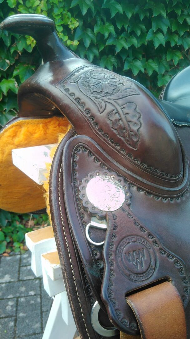 Triple W western saddle, hardly used, flowers in chocolate brown - Very nice, hardly used western saddle in chocolate brown with floral embossing. Total length approx. 64cm Width between the conchas approx. 27/27.5cm