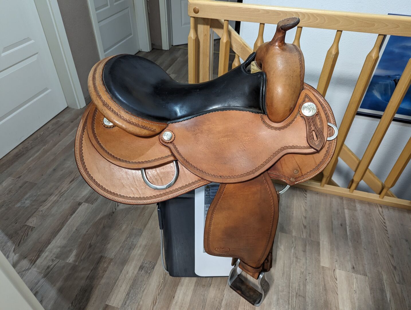 Western saddle by Ralf Dinsinger with XFull Flex tree - Selling my very well preserved western saddle by Ralf Dinsinger, it has an XFull Flex tree, the saddle was on a Black Forest cold blood, has a slight swing, is 68cm long and has a 16er seat. The saddle is 5 years old, has always been well cared for and has turned-out fenders. It has no flaws, only signs of wear on the fenders, which unfortunately cannot be avoided. The saddle is only being sold because my horse has changed a little. The seat is super soft, so good for very long rides. It is sold as pictured with aluminum stirrups. This is a private sale, I sell under exclusion of any warranty.