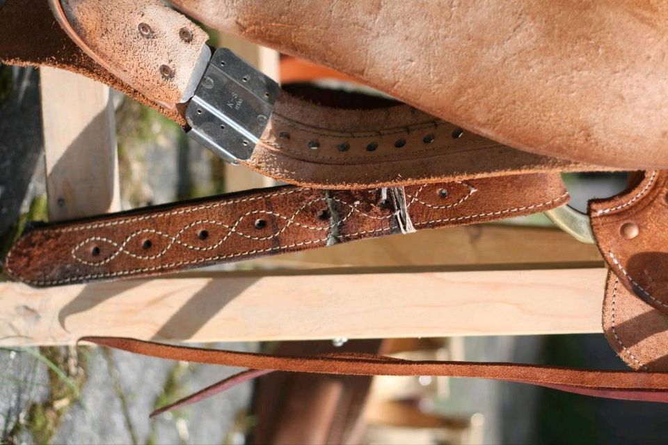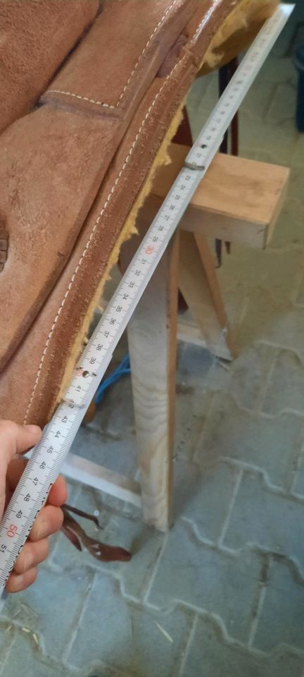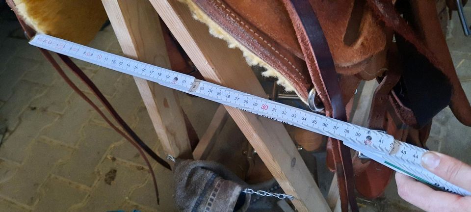 Western saddle- very nice, comfortable, roping or trail - - Selling a 2 year old western saddle of the brand "Old Time Vaquero Gear". Used for approx. 1 year, stored dry since then Made in Italy. - Very suitable for work on cattle -Light, almost beige coloring with color contrasts - brown/beige - Wide pommel approx. 9cm (see picture). -Rear approx. 44cm (see picture) - Front approx. 35 cm (see picture) - 2 very chic and comfortable bucking rolls in dark brown. - The edges of the straps on the side of the saddle (see picture) are decorated with brass, extraordinary. (see picture) - Wide hind pommel (I think it was an inch of 17 or 17.5)