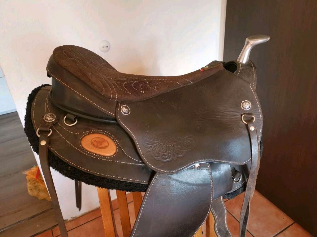 Western saddle, western saddle. Treeless from Ghost - Treeless western saddle from Ghost (Italy) Saddle is complete with fender (stirrup leathers) Stirrups are not included, but can be left on for an extra charge of 49.00 saddle length 58cm incl. pad and saddle guard Fits any horse because the Maß geklettet werd